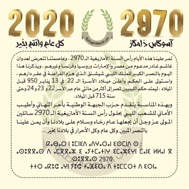 تمر علينا هذه الأيام رأس السنة الأمازيغية الـ 2970 ، وعاصمتنا تتعرض لعدوان غاشم غادر مدعوم من مصر والإمارات وروسيا وفرنسا وغيرهم ، ويذكرنا…