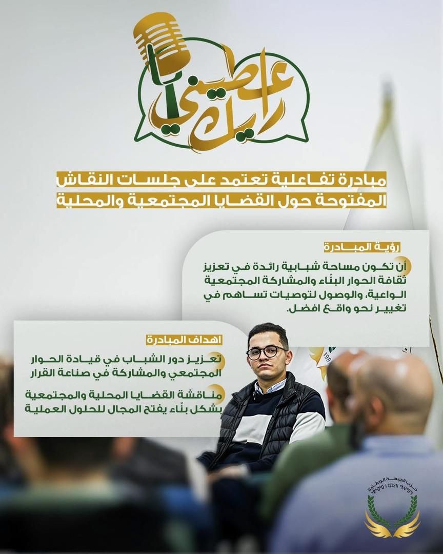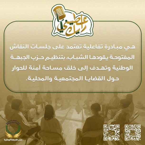 مبادرة تفاعلية شبابية يطلقها حزب الجبهة الوطنية، تقوم على جلسات نقاش مفتوحة يقودها الشباب. تهدف هذه المبادرة إلى: حزبالجبهةالوطنية تجديد_ال…