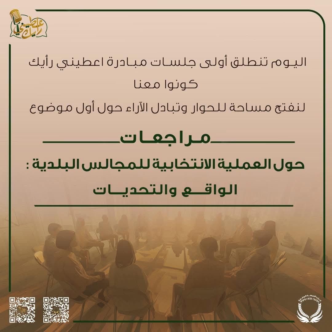 تنطلق اليوم أولى جلسات مبادرة اعطيني رايك ، وقد استهدفت هذه الجلسة المرشحين للمجالس البلدية في الجولة الأولى والثانية ، والفائزين بعضوية ال…