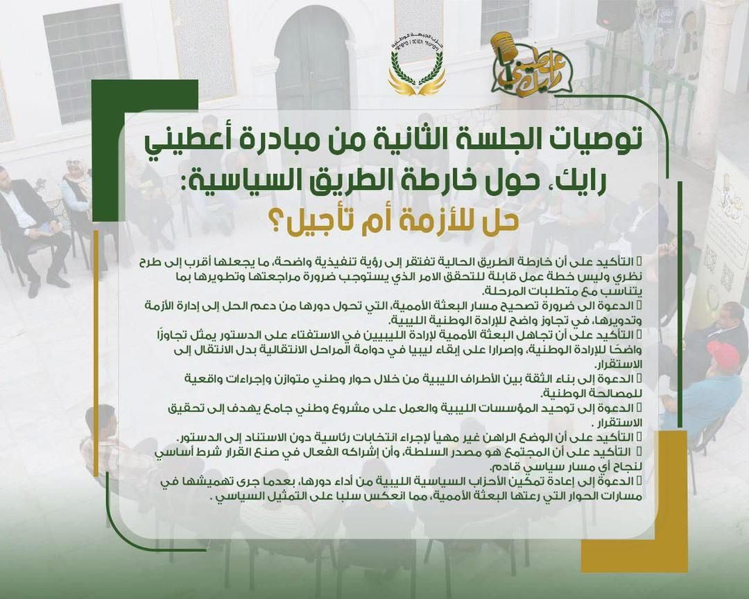الدعوة إلى إعادة تمكين الأحزاب السياسية الليبية من أداء دورها، بعدما جرى تهميشها في مسارات الحوار التي رعتها البعثة الأممية، مما انعكس سلبا على التمثيل السياسي .