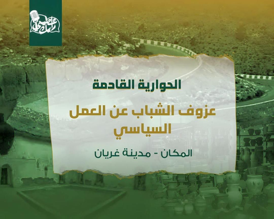 جلسة مفتوحة لمبادرة اعطيني رايك في مدينة غريان غداً السبت 25/ اكتوبر/ 2025 نستمع إلى آراء الشباب وتجاربهم، ونبحث معهم عن حلول واقعية تُعبّر عن صوتهم وتطلعاتهم.